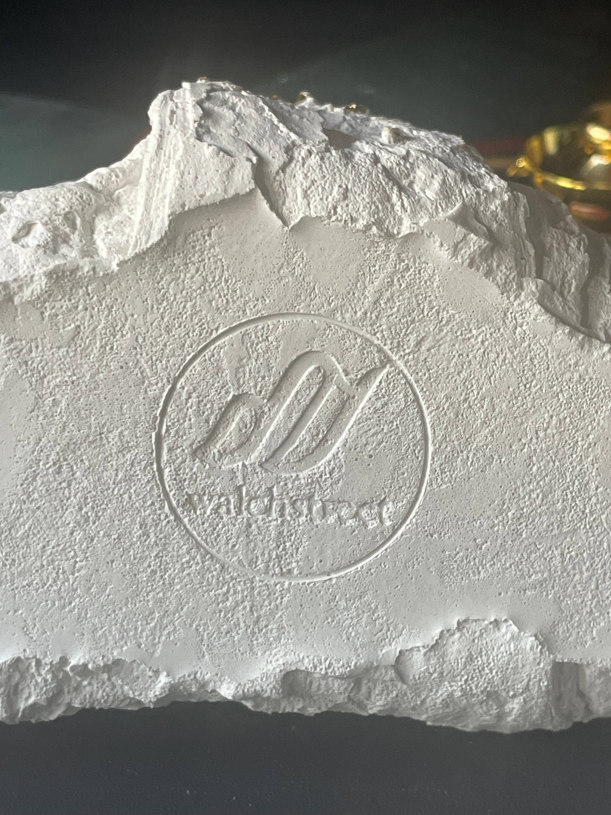 Handgegossen, sanft geschliffen und in natürlichem Weiß belassen. Die angedeuteten Nusskörner auf der Oberfläche sind mit goldfarbenem Blattmetall akzentuiert - ein stilles Detail, das Glanz ohne Übertreibung bringt.